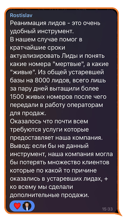 Всё это легко решается с помощью автопрозвона! На каждую 1 000 номеров вы получите от 7 до 14 реанимированных лидов по цене от 15 рублей!